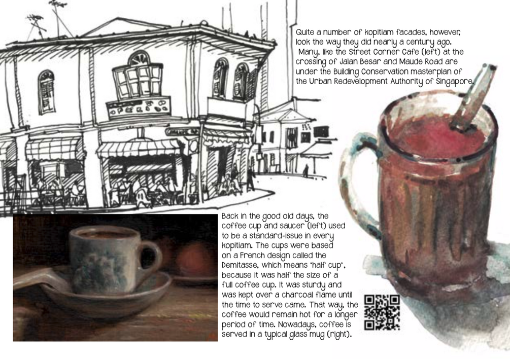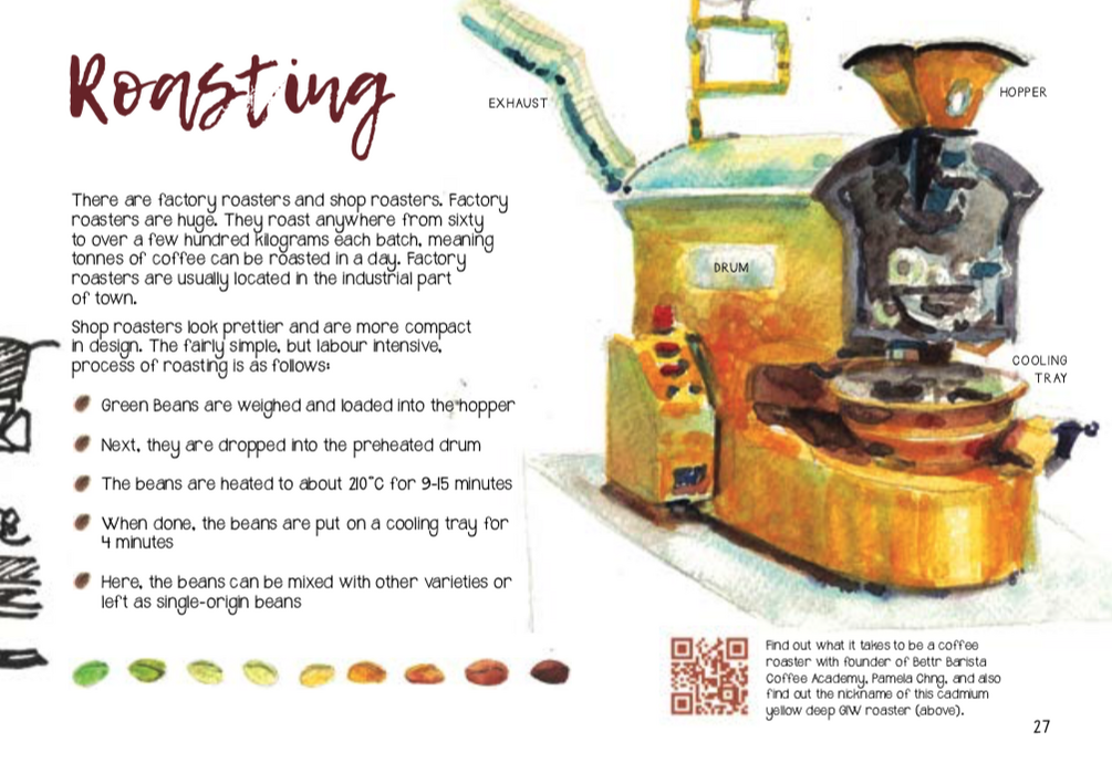 98 pages filled with 200 over sketches in oil paints, watercolours, inks and embedded videos via QR codes. With a heap of information about local coffee in Singapore.